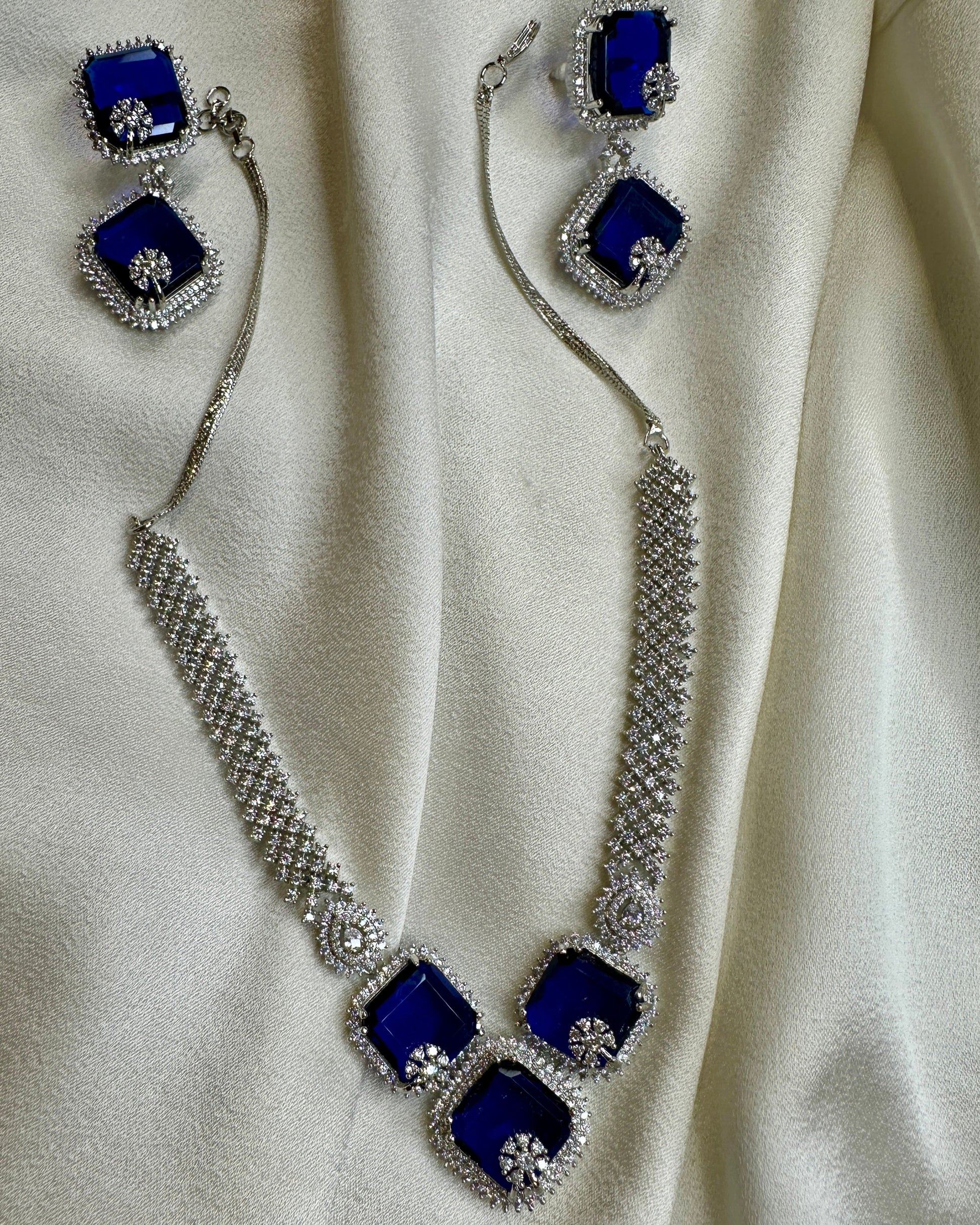 This American Diamond set is where timeless charm meets bold design. Crafted on a durable brass base and precisely machine-set, the necklace and earrings feature deep navy blue square stones framed in sparkling AD halos. The wide mesh-style chain adds an extra layer of texture, making it a standout choice for both traditional and contemporary outfits.