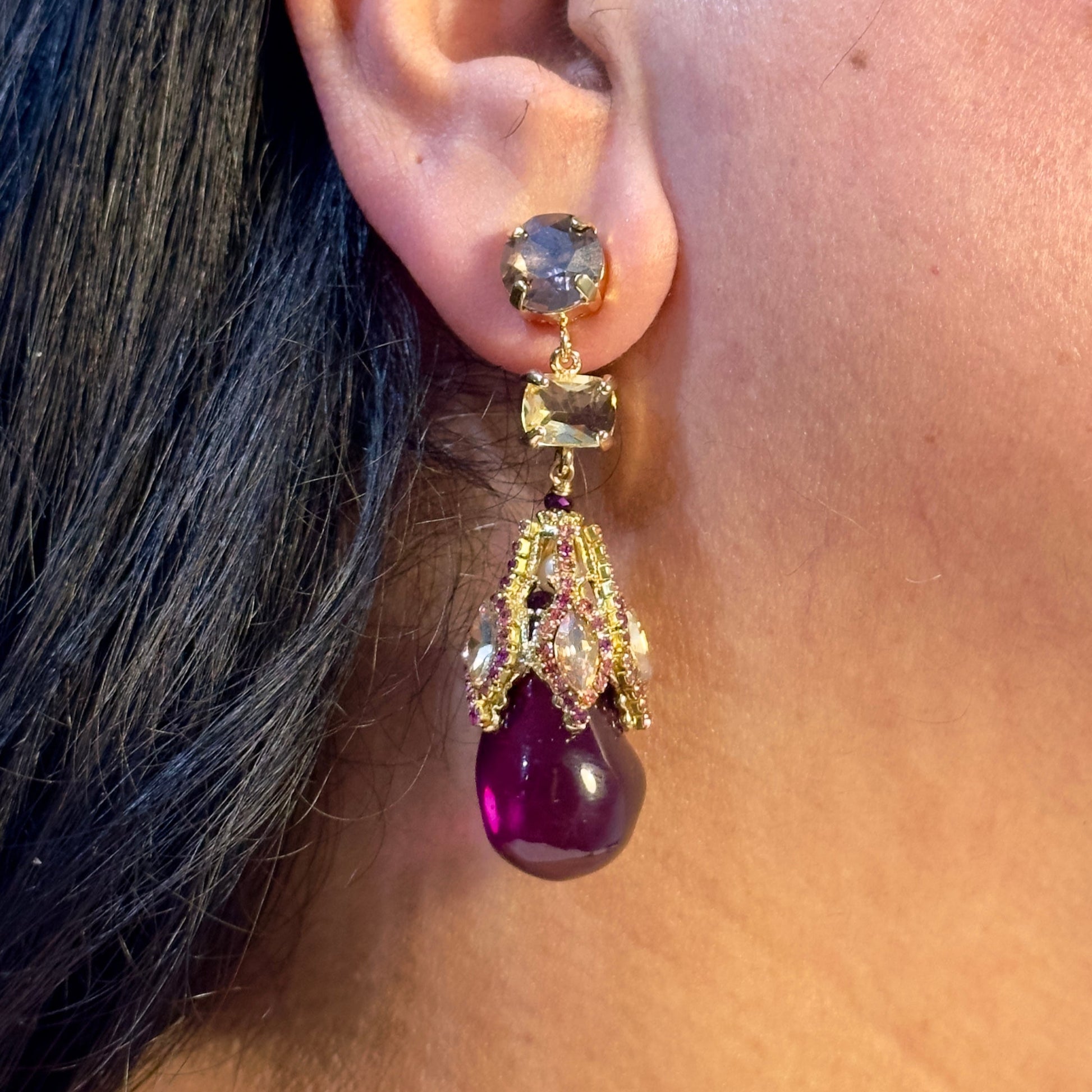 These earrings blend old-world charm with contemporary styling. The rich berry-toned drop adds a pop of colour to neutrals and contrasts beautifully with gold and crystal details for a luxe, heirloom-inspired look. Perfect for parties, weddings, and special dinners.