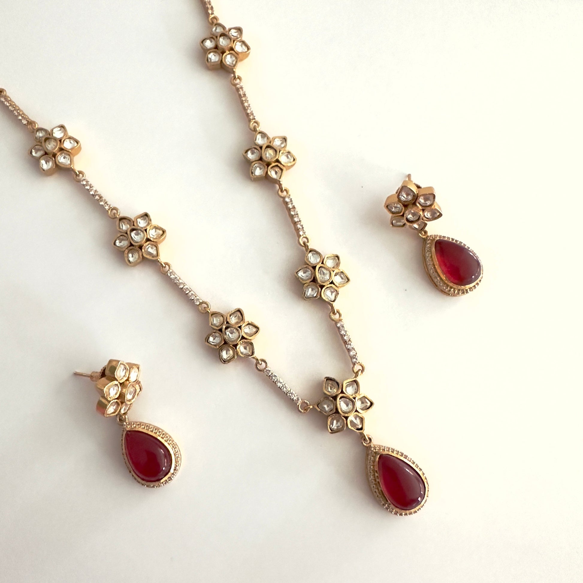 The Tara Contemporary Polki Set carries the same intricate demi-fine craftsmanship in a bold, regal palette. Uncut polki clusters bloom across the necklace, finished with striking crimson red teardrop semi-precious stones for a richer, more dramatic look. The gold-plated finish enhances its luxe appeal, with coordinated earrings completing the set.