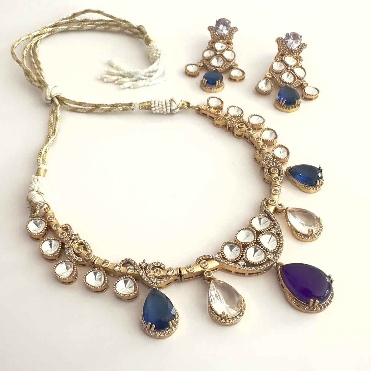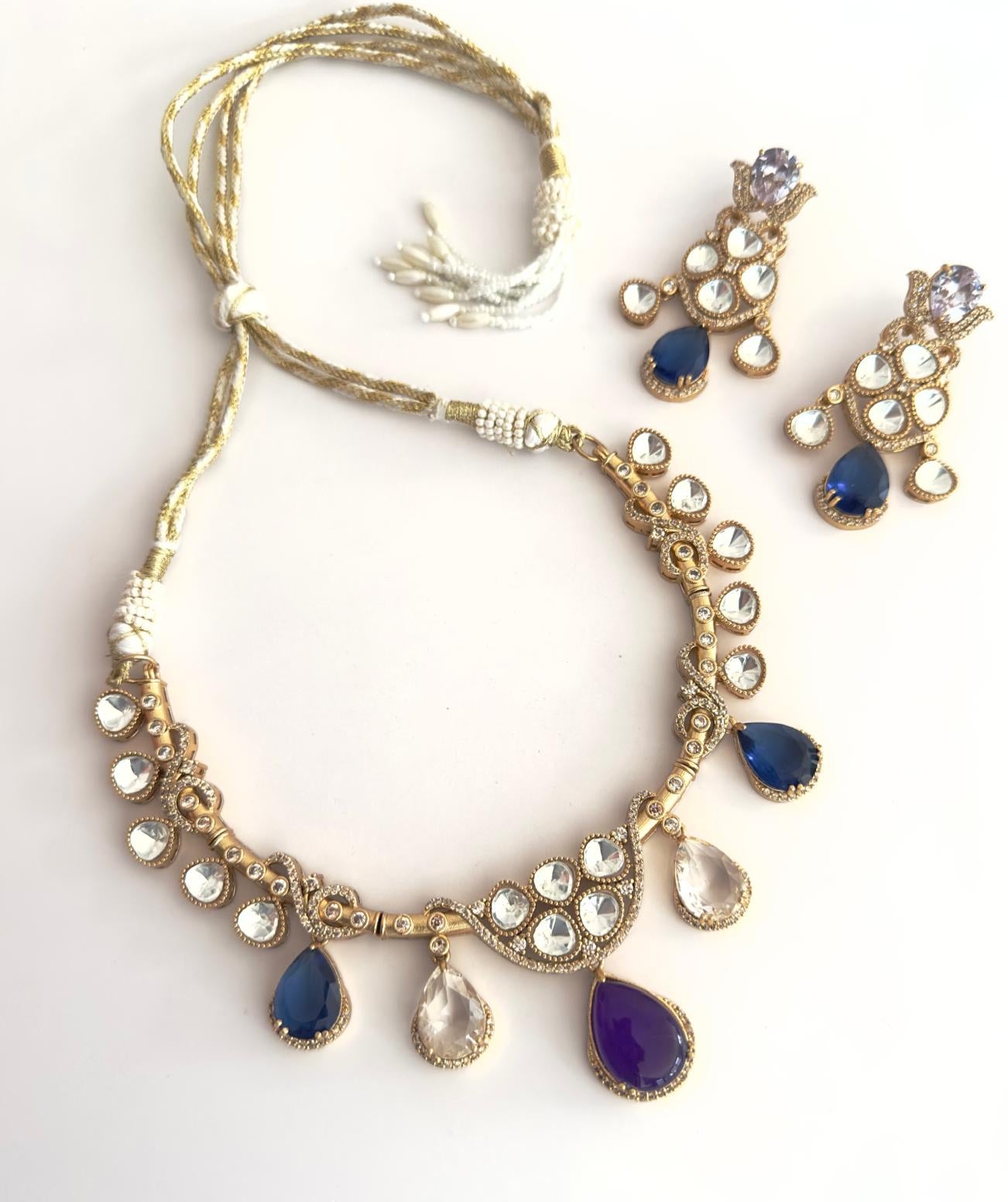 The Neelaya Polki Set is a neo-traditional polki necklace handcrafted with precision and artistry. Featuring uncut polki stones with purple, sapphire-toned and clear semi-precious drops, this jewellery set blends classic Indian design with modern elegance. Perfect as a wedding necklace set, sangeet jewellery, or festive statement piece, it comes with matching earrings and an adjustable dori for a secure and comfortable fit.
